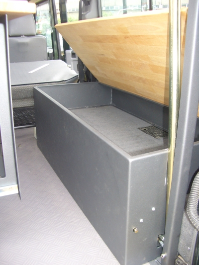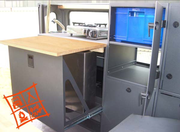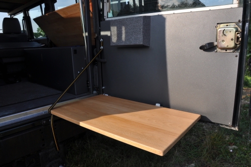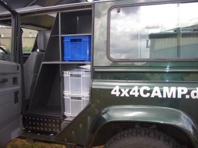 Stauschrank vorne, Zuagng von Innen und Ausen AusbauKonzept Tischplatte - Einsatz an der Hecktüre spaceBOX DEF 4P Sie nutzen Ihren ONETEN im Alltag, mir der Familie und als "Fluchtwagen" für die kleinen und großen Abenteuer in Ihrer Freizeit? Dann ist der spaceBOX DEF 4P Ausbau mit 4 -5 Sitzplätzen und einem zusätzlichen Bett im Fahrzeug rwie geschaffen für Sie. spaceBOX DEF 4P ist das modulare System für den Inneausbau für den Landrover Defender zur viersitzigen Nutzung. Wie bei allen spaceBox Ausbautenverwenden wir auch hier für den Korpus, Türen und Klappen 2,5mm Aluminium, beschichtet in "wolfgrey". Durch den dünnwandigen Auf-bau wird ein Plus an Stauvolumen bei geringem Gewicht und robustem Aufbau erzielt. Die Tischplatten und Sitzbankauflagen bestehen aus Birkemultiplexplatten geölt. Das gesamte Ausbausystem besteht aus folgenden Modulen - Bodenplatte, - Küchenblock, - Stauschrank links - Stauschrank links schräg - Längssitzbank rechts- Liegeflächensystem Der Aufbau aller Einzelmodule erfolgt auf einer soliden wasserfest verleimten Multiplexplatte. Die Oberseite ist mit einem PVC Belagbeschichtet. Zur Wärme und Schalldämmung ist die Platte mit 10mm Isolieplatten unterlegt. Die Befestigung am Fahrzeugboden erfolgt an Originalbefestigungspunkten.Der Küchenblock ist mit einem Schwerlast Vollauszug versehen. Dadurch können Kompressorkühlboxen mit einem Volumen bis zu 40L untergebracht werden. Der Vollauszug nutzt die gesamte Tiefe bis in die Ausbuchtung der Karosserie . Daher entsteht hinter der Kühlbox wertvoller Stauraum. Die Oberseite des Küchenblocks nimmt eine Rundspüle mit ausziebarer Handbrause auf. Diese bietet durch Anordnung in Nähe der Hecktüre zusätzlich die Nutzung als Ausendusche. Die Wasserversorgung übernimmt dabei eine druckgesteuerte Membranpumpe. Durch die zum Heck oriente Rundspüle steht ausreichend Arbeitsfläche auf dem Küchenblock zur Verfügung. Ein- oder mehrflammige Kocher können hier abgestellt werden. Weiter verfügt der Küchenblock über eine untere und eine heckseitige Klappe die sich zur Aufnahme von Kleinuntensilien bzw. Geschirr eignet. Der Tisch wird an der Oberseite des Küchenblocks in einen Schiebebeschalg eingehängt und stützt sich bei teilweise ausgezogenem Auszug auf dessen Oberkannte ab. Dadurch ist eine auserordentlich stabile Tischauflage gewährleistet. Gleichzeitig steht ausreichen Beinfreiheit Flexibi- lität in Längsrichtung des Wohnbereichs zur Verfügung ohne den Tisch vollständig aushängen zu müssen. Die Tischplatte kann auserdem auch an der Hecktüre verwendet werden. Hier findet sie auch bei Nichtgebrauch oder während der Fahrt Ihren Platz. Die beiden links angeordneten Stauschränke sind von Ihrer Grundgeometrie so geschaffen das Stappelboxen mit den Abmessungen 350x270x210mm eingeschoben werden können. Dies erleichtert das Handling und erspart Sucherei. Die Schränke nehmen jeweils vier dieser Boxen auf. Der vordere Schrank kann zusätzlich von Ausen beladen werden und bietet sich damit auch für den Einbau einer Kanisterwasseranlage an. In der Schräge hinter dem Sitz entstehen offene Fächer die sich für den direkten Zugriff auf Klei- dungsstücke eignen. Alternativ zu einer Kanisteranlage kann ein flacher Wassertank mit 65 L im Bodenbereich montiert werden. Die Oberseite ist mit einem Bord umgeben Karten und Reiseliteratur finden hier ihren Platz Auf der rechten Seite bietet eine Längsbank zwei Sitzplätze. Der Korpus bietet mit einem Volumen von etwa 80L viel Stauraum - auch für lange Ausrüstungsgegenstände wie Stühle oder Rolltische. Bei Einsatz des eltrohydralischen Hubsystems ist hier das Miniaggregagt montiert.Zur Erweiterung der Schlafplätze bietet das Liegflächensystem bei Fahrzeuge der Baureihen 300 TDI und TD5 die Möglichkeit in Verbindung mit der hinteren Seriensitzbank im unteren Berich ein Bett mit den Abmessungen 1000x1900mm zu ergänzen. Hierzu werden auf der Lehne der Serienbank zwei Böden mit Klappmechanik montiert. Bei nach geklappter Lehne verlängert das System die Fläche bis zum Armatuerenbrett. Der herausnehmbare Sitzbelag der Längsbank ergänzt die Fläche nach hinten. Gemeinsames Merkmal aller spaceBOX-Module ist die Verwendung hochwertiger,funktionaler Beschlag- und Bedienelemente. Scharnier und Verschlüsse sind Ausen aufgsetzt um den Stauraum nicht weiter einzuschränken. DIe Oberfläche in wolfgrey bietet eine wertige und angenehme Haptik, ist hart im nehmen und zudem leicht zu reinigen. Preisbeispiel Preis ab 9500€ incl.19% ges. Mwst.